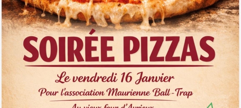 Soirée pizzas cuites au vieux four communal pour l'association Maurienne Ball Trap. Choix entre plusieurs pizzas. Royale : Sauce tomate, mozzarella, jambon blanc, champignons