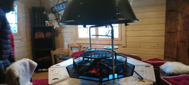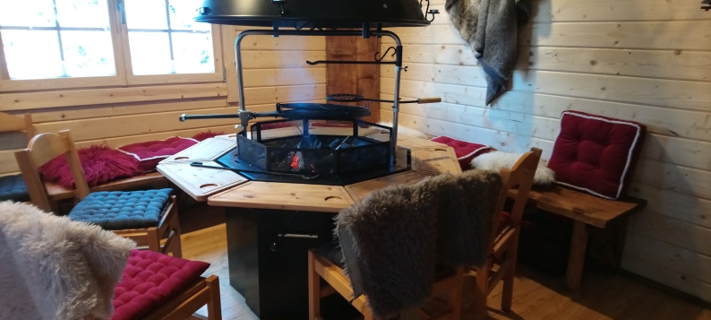 Vous dégusterez votre repas autour du grill, dans une ambiance conviviale (12 convives max). Chaque soir, un menu composé de produits régionaux, à base de viande ou de fromage et dégusté dans de la vaisselle en bois.