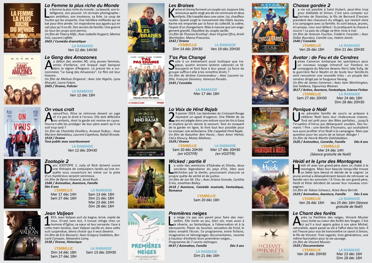 jeune public à partir de 6 ans (films et dessins animés adaptés aux enfants et goûter offert sur certaines séances de ciné-goûter), blockbusters. En saison touristique, des séances sont programmées durant la semaine
