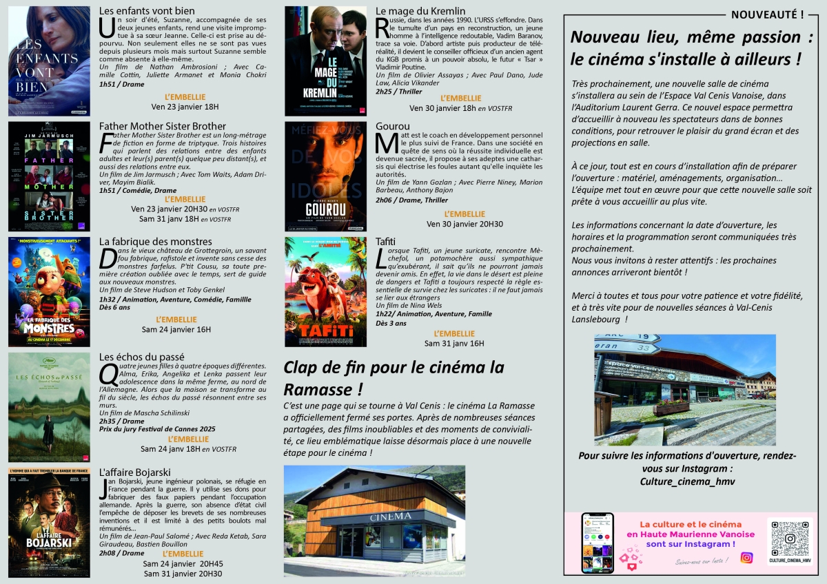 Le cinéma La Ramasse à Val Cenis Lanslebourg est ouvert toute l'année avec une programmation qui mêle films grand public,