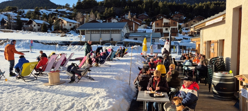 Siroter ! Un chocolat ou un vin chaud au soleil avec un panorama exceptionnel sur les sommets enneigés.