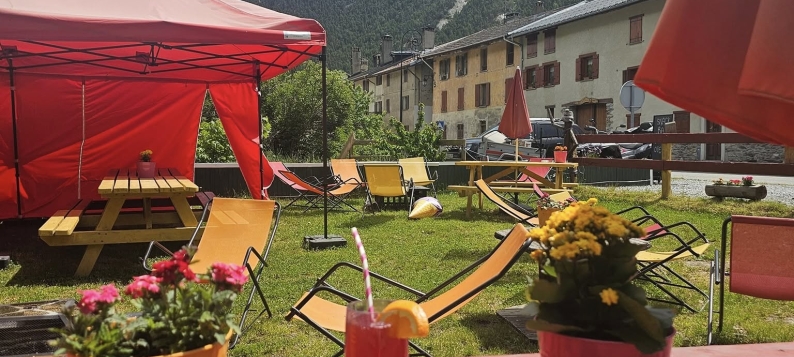 Marie vous accueille dans un bel espace aménagé en extérieur, entouré d'arbres et bordé par un ruisseau. Un espace de détente pour passer un bon moment avec boissons, glaces et restauration à toute heure.