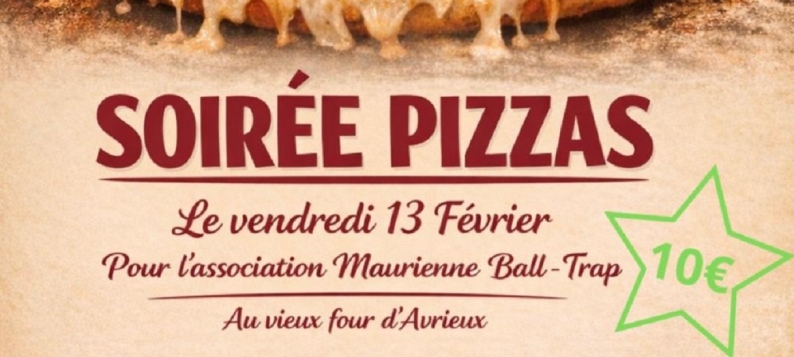 Soirée pizzas cuites au vieux four communal pour l'association Maurienne Ball Trap. Choix entre plusieurs pizzas. Royale : Sauce tomate, mozzarella, jambon blanc, champignons