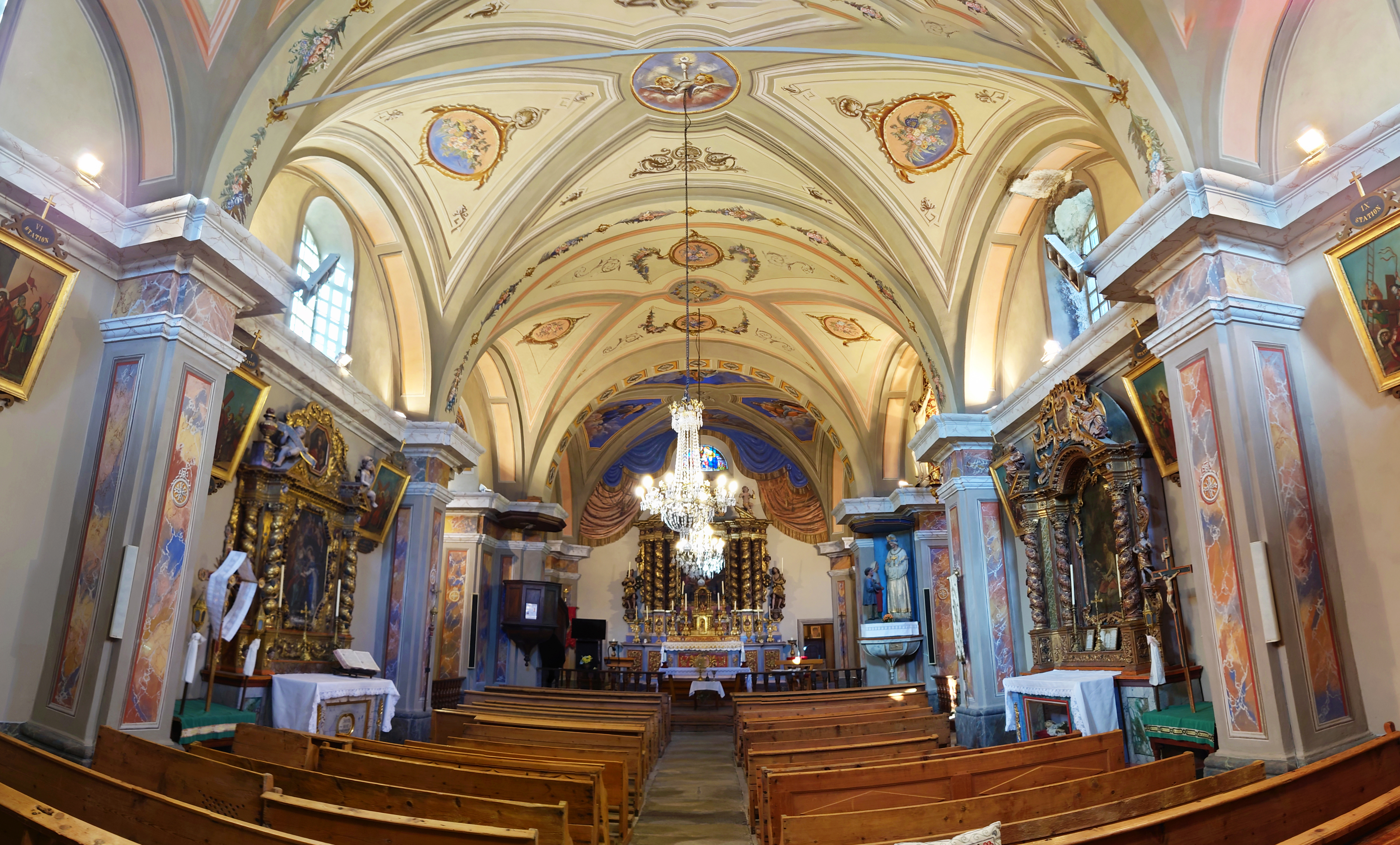 A l’intérieur, les décors réchauffent le cœur : pas moins de 5 retables vous attendent ! Le principal a la particularité d’avoir été réalisé en 1680 par Molino et Todesco, deux maitres-sculpteurs originaires de la Val Sésia (Piémont) et non de Haute Maurienne, mais tous ont des caractéristiques particulières, volutes « en rocailles » ou bois polychrome, qui séduiront vos pupilles ! L'église abrité également la chasuble de la Reine Marie Christine, un exceptionnel ensemble de vêtements liturgiques en soie brodé de motifs floraux en fil de soie et d'argent