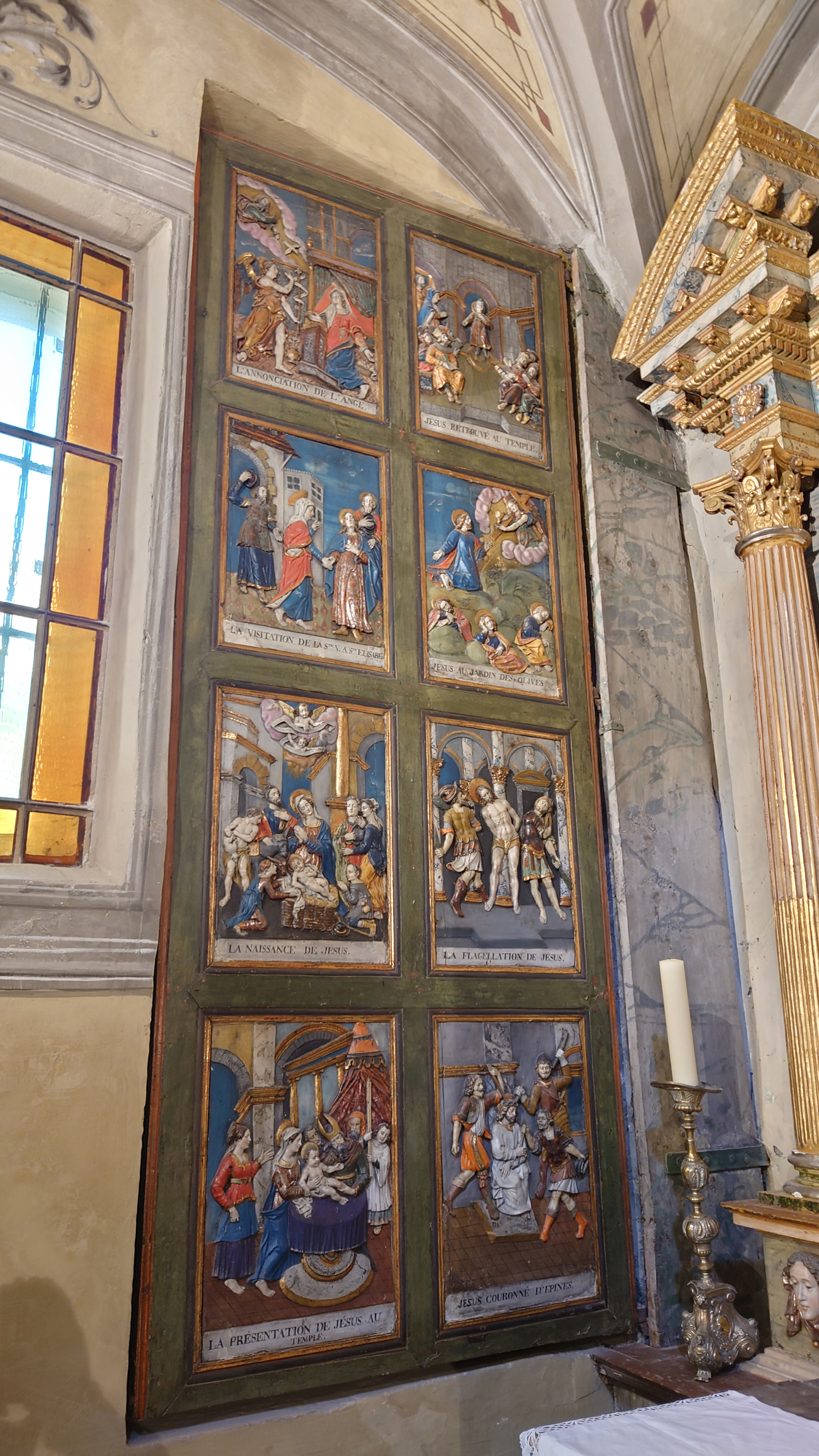 Le chef d’œuvre de l’édifice ? Son retable du Rosaire : placé à gauche, près du chœur, il est constitué de deux volets se fermant sur un panneau central fixe. L’extérieur des volets est orné d’un décor peint en « grisaille » avec lequel les couleurs vives et la dorure de l’intérieur - et du panneau central - créent un contraste éblouissant. Le tout fut sculpté de main de maitre par Jean Clappier, un grand artiste local.