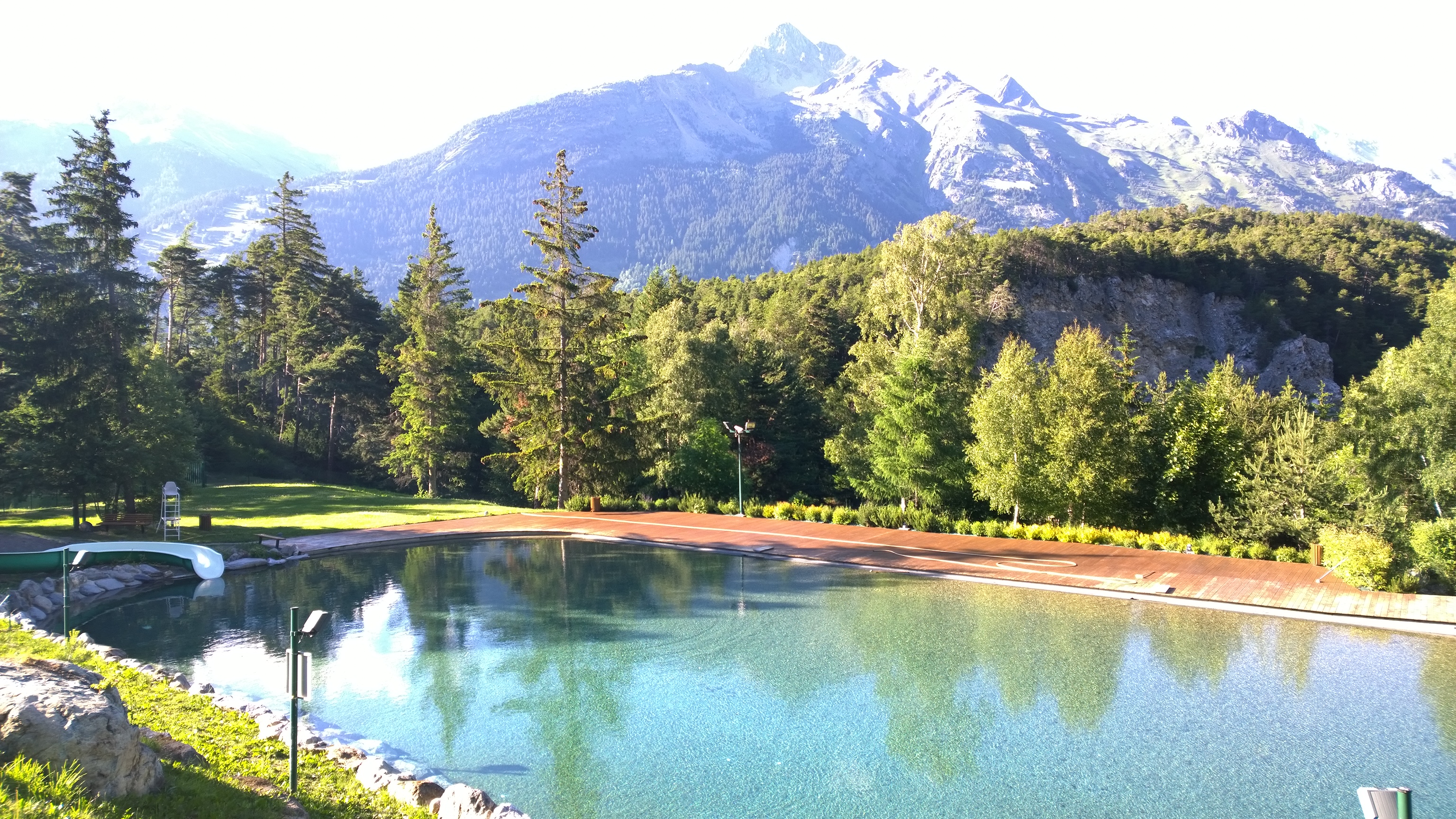 Nager et s'amuser avec une vue imprenable sur les montagnes. Plan d'eau pour la baignade de 1000 m², d'une profondeur de 30 cm à 1,60 m. Toboggan d'eau ludique. Plage en bois et en herbe.