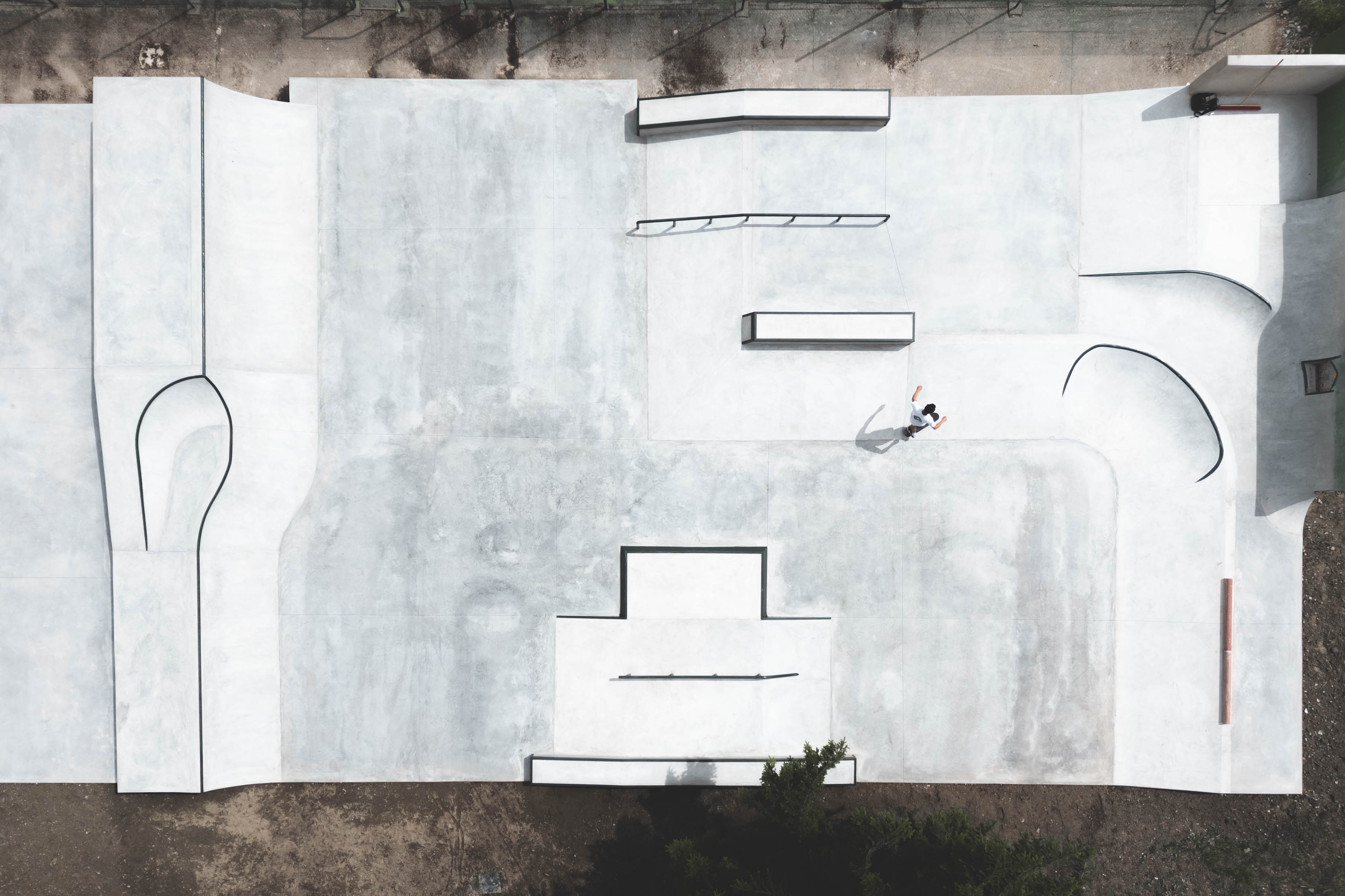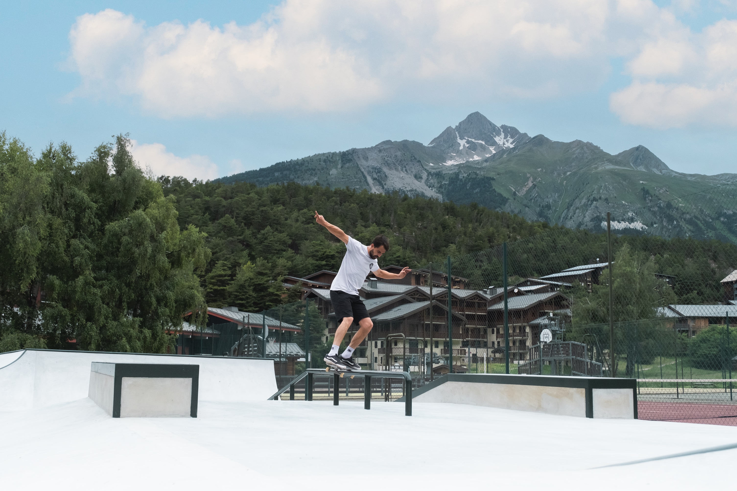 Le skate park présente une surface de 450m² avec courbes, murets de glisse, copings, barres de glisse sur dallage béton.