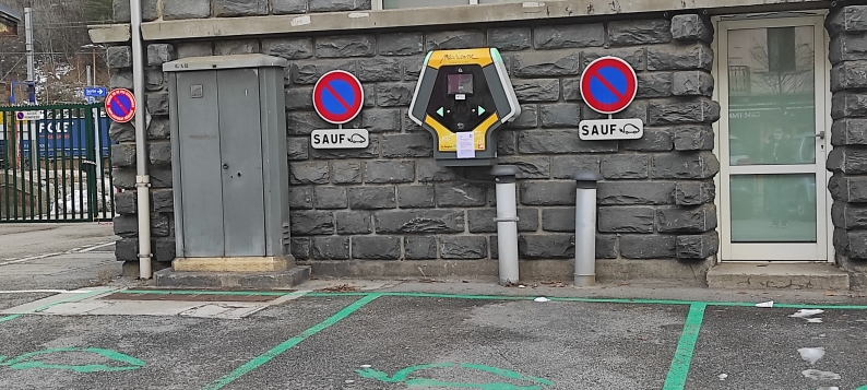 Terminal with 2 charging points (1 of 22 kW type 2 and 1 of 3kW type E). Simultaneous charging possible. Need to have an account to access the eborn map and find out if the terminal has any free spaces.