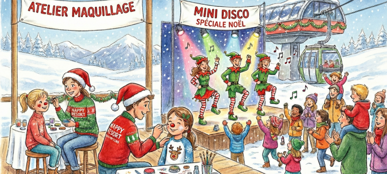 End-of-day entertainment for children: Christmas elves Mini Disco and make-up workshop on the Place du thabor while waiting for Santa Claus! Share a moment of dance and fun for the kids, with the Happy-Resort animation team. You can also have your make-up done in Christmas colors, free of charge.