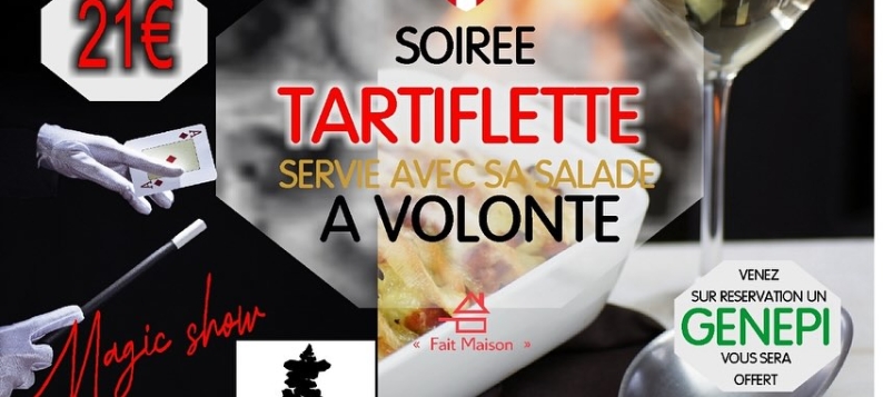 All-you-can-eat Tartiflette evening with magician Xanadu. Come along on reservation, a génépy will be offered.