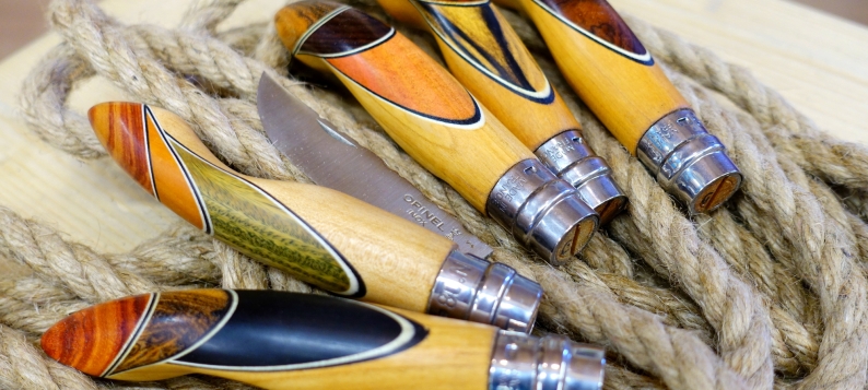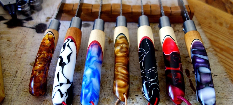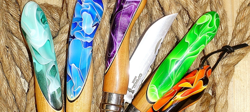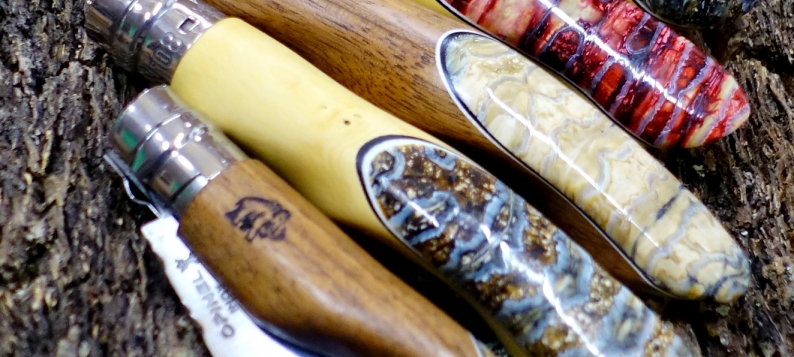 Assemblages de matériaux divers : bois précieux, résines acryliques, bois de cerf, fibre de carbone, molaire de Mammouth fossilisée... Un Opinel, quelques morceaux de bois ou autres matériaux et un peu d'imagination...