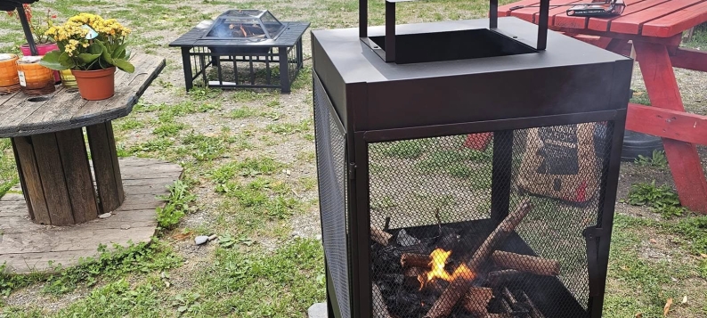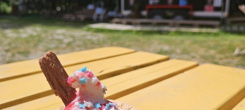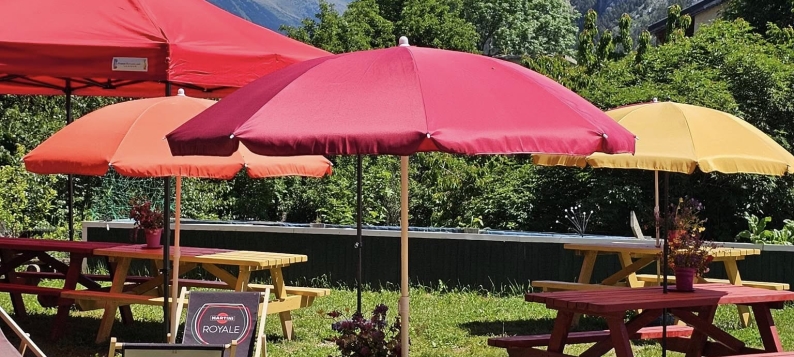 Marie vous accueille dans un bel espace aménagé en extérieur, entouré d'arbres et bordé par un ruisseau. Un espace de détente pour passer un bon moment avec boissons, glaces et restauration à toute heure.