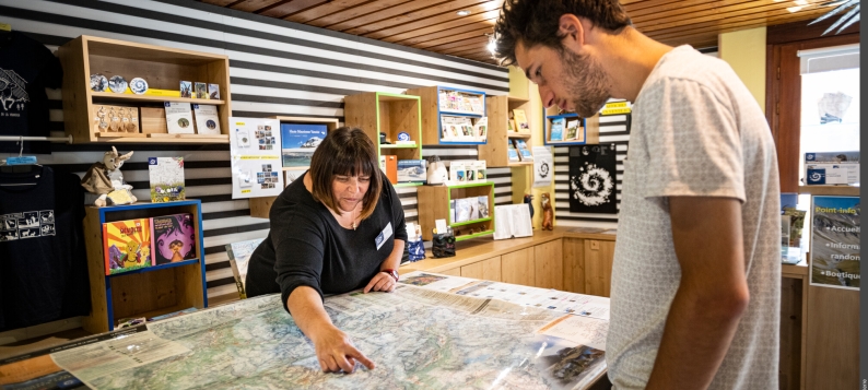 L'été, elle assure la réservation des randonnées accompagnées par les gardes-moniteurs du Parc et la vente de produits Parc (cartes postales, ouvrages, DVD ...).